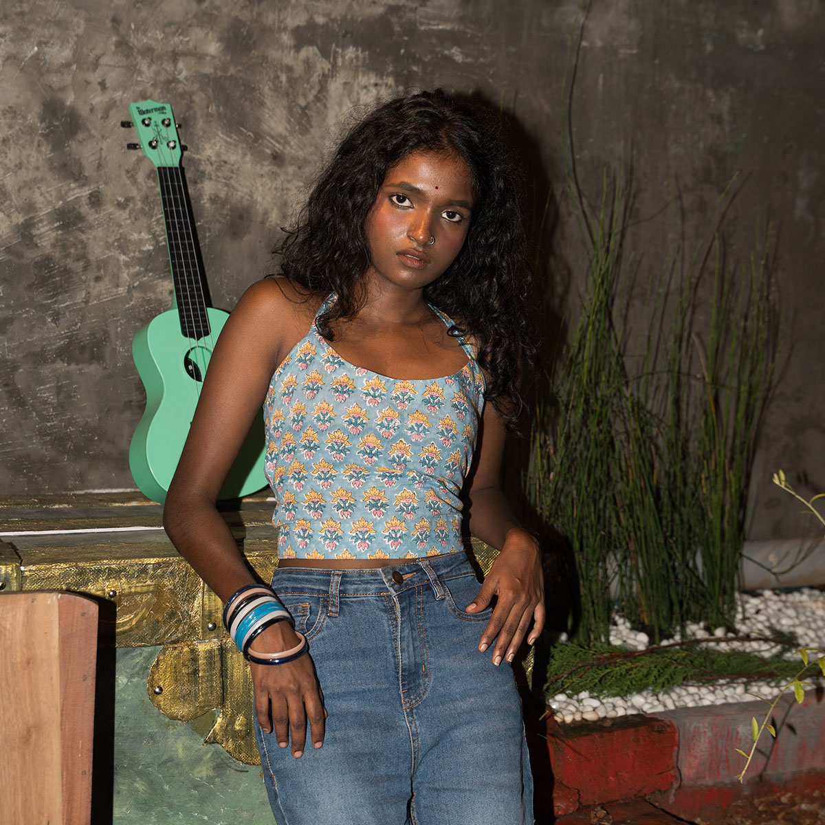 Sarojini Hand Block Printed Halter Neck Crop Top